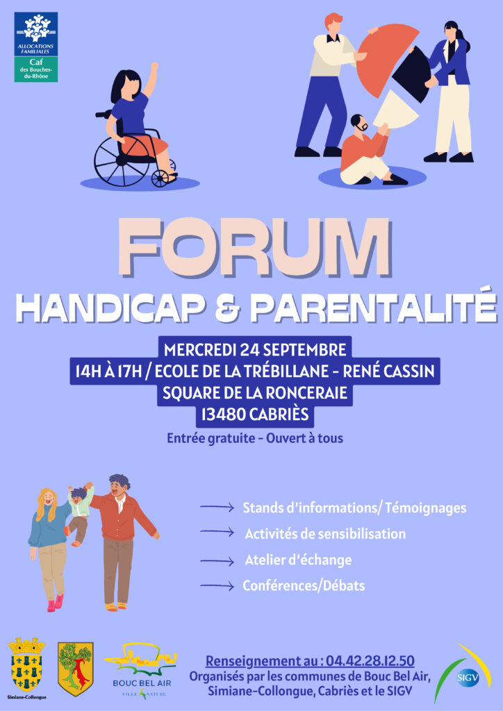 Forum handicap et parentalité Accueil » Agenda » Forum handicap et parentalité mercredi 24/09/2025 14h au mercredi 24/09/2025 17h Square de la ronceraie, Cabriès gratuit Mercredi 24 septembre, venez découvrir le forum handicap et parentalité ! Toutes les infos pratiques sur l’affiche ci-dessous Partager cet article
